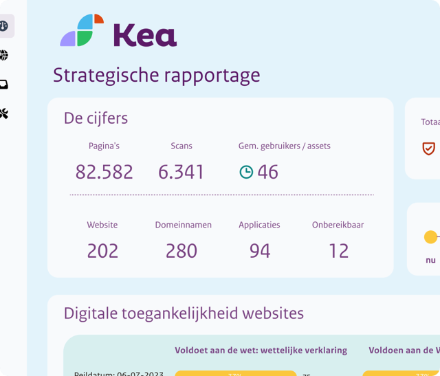KEA is het platform dat de Cilde-aanpak ondersteunt. Het geeft automatisch inzicht in je volledige webportefeuille en analyseert sites en apps op toegankelijkheid, beveiliging, privacy, archivering en CO₂-footprint. KEA helpt bij lifecyclemanagement: wat blijft, wat verbetert en wat kan uit. Dankzij slimme workers en lokale AI combineert KEA automatisering met veiligheid en controle. Het platform wordt ontwikkeld en gevalideerd met (semi)publieke organisaties.
